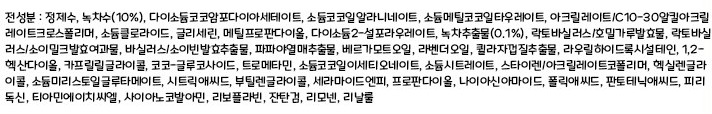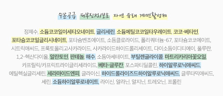보습인자(NMF)가 수분막을 형성해 주고 3중 히알루론산 성분이 보습감을 유지해 주며, 피부를 진정시켜 주는 성분인 '판테놀, 알란토인, 세라마이드엔피'가 함유되어 있습니다.