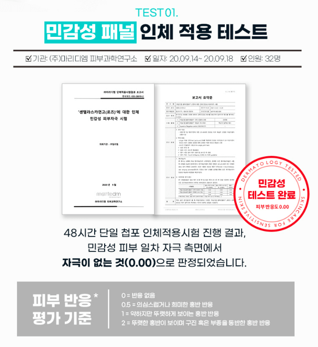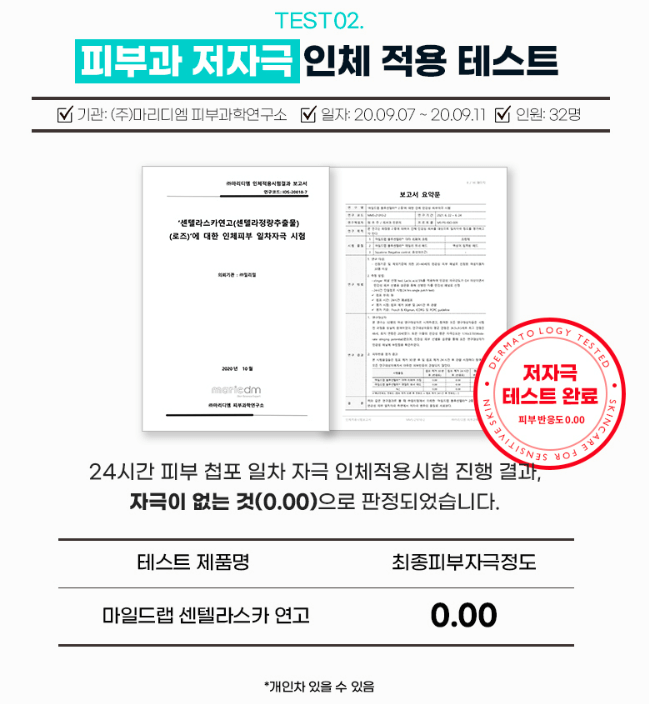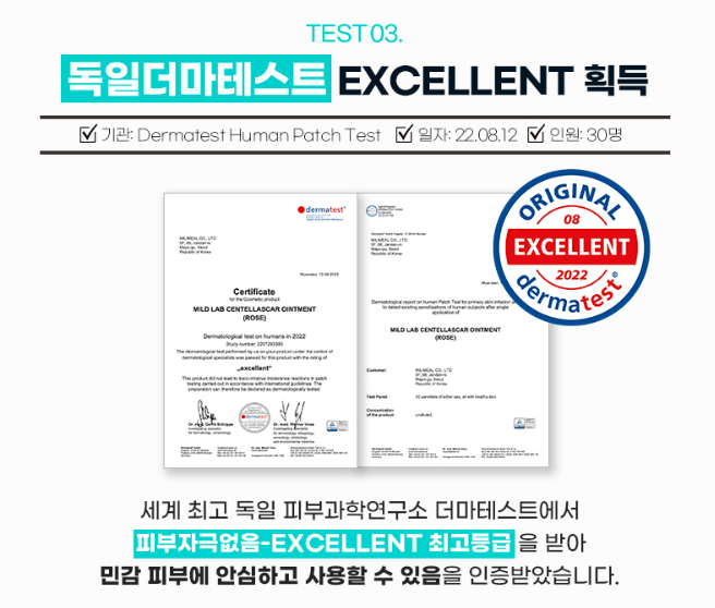 민감성 피부의 인체 적용 테스트와 저자극 테스트에서도 0.00의 무자극이라는 결과를 받기도 했으며, 세계 최고 독일 피부과학연구소 더마테스트에서도 최고 등급을 받아 안심하고 사용할 수 있습니다.
