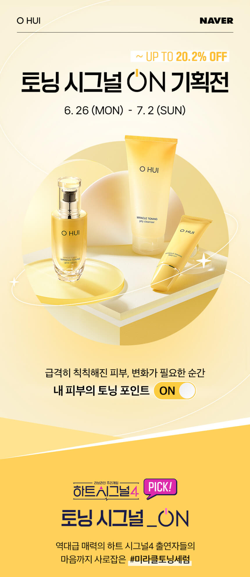오휘는 <하트시그널4> 방영 기념 토닝 시그널 기획전을 개최하여 오는 7월 2일까지 아래의 링크를 통해, 동일 용량 리필까지 1:1로 증정하여 2배 용량으로 구입할 수 있습니다. 또한 세럼뿐만 아니라 방송에 나온 미라클 토닝 라인(선크림, 워터패드, 클렌저)을 구입할 시, 하트 모양의 그립톡과 토닝 체험 키트를 함께 증정하는 이벤트를 진행합니다.